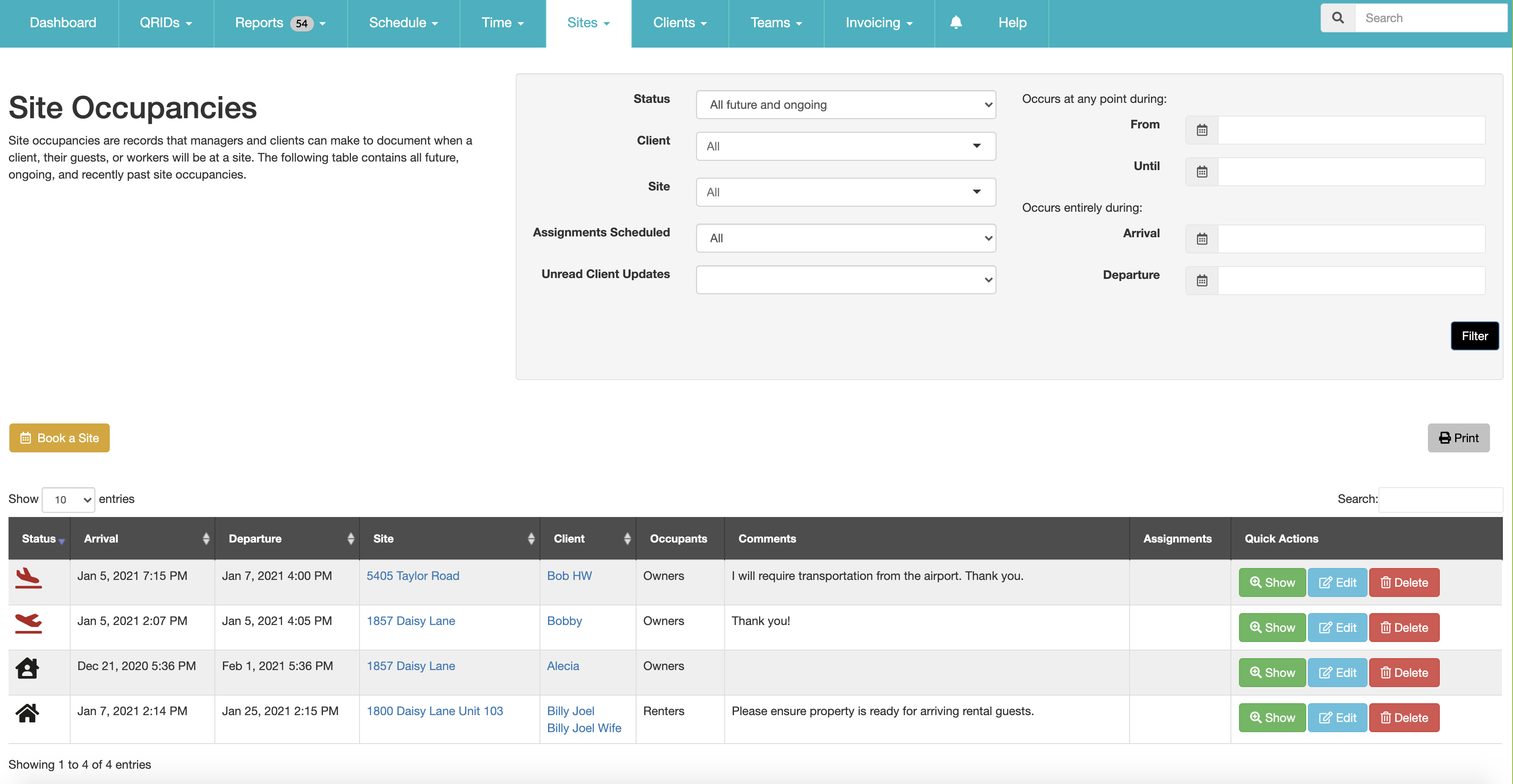 Keep track of when your clients and their guests will be occupying their properties. Recieve email notice about upcoming arrivals and departures. Clients can book arrivals and departures right from their Client Dashboard.